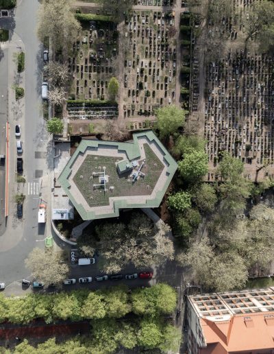 Das Objekt befinden sich in heterogener Umgebung zwischen denkmalgeschützter Schule, gewachsener und neuerer Stadtstruktur am Rande eines denkmalgeschützten Friedhofs. Die neue Bebauung schafft 50 identische, einkommensorientiert geförderte 2-Zimmer-Wohnungen zur Miete, die als flexibel nutzbare, barrierefreie Seniorenwohnungen sowohl von einer als auch von zwei Personen genutzt werden können. Im Erdgeschoss befindet sich die Tagespflege.